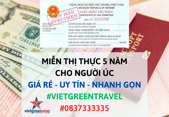 Dịch vụ làm Giấy miễn thị thực 5 năm cho người Úc tại Việt Nam (còn được nhiều người gọi là visa 5 năm, hoặc giấy miễn thị thực 5 năm, tiếng Anh là Vietnam 5-year visa exemption certificate) vào Việt Nam được cấp cho đối tượng là người Úc có vợ/ chồng/ con của công dân Việt Nam; hoặc người Việt Nam định cư ở Úc. Giấy miễn thị thực này giống như một loại visa dài hạn, và người được cấp, được phép nhập cảnh vào Việt Nam bất kỳ thời điểm nào trong hiệu lực 5 năm. Khi làm Giấy miễn thị thực, Giấy miễn thị thực cho người Úc, Giấy miễn thị thực 5 năm cho quốc tịch Úc, Viet Green Visa uy tín xin liên hệ 0837333335