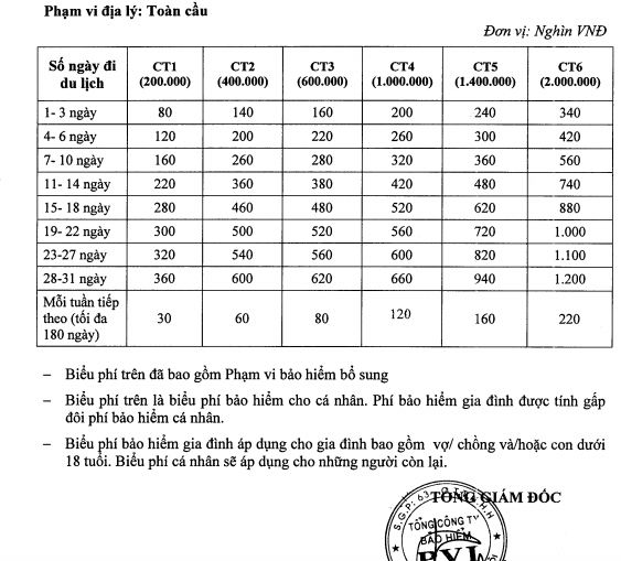 BIỂU PHÍ CÁC GÓI BẢO HIỂM XIN VISA